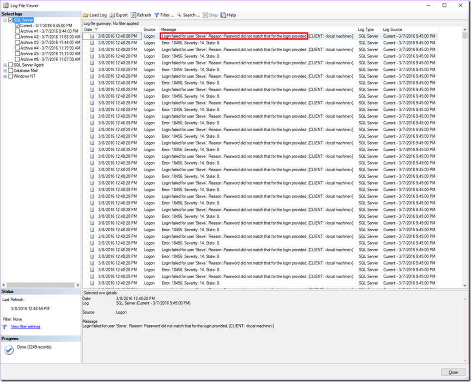 The easiest place to find this type of attack is in the SQL Server error logs. The error most commonly seen is 18456. Though this can appear for many reasons, you’ll want to examine the error reason and look for “Password did not match”. It’s worth noting that this can occur from normal activity, where a user simply mistypes the password; however, in the case of a brute force attack you’ll see hundreds or thousands of these errors.