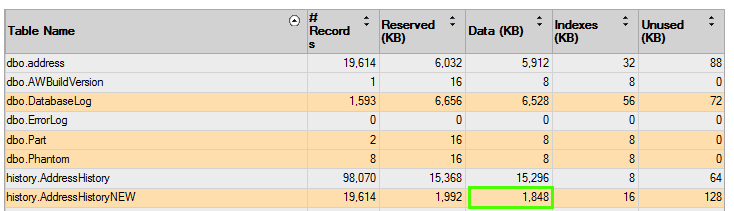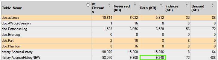 As you can see the system generated table is nearly half the size of the user created table. I scripted the tables to compare and they were the same! I then looked at Object Explorer and noted that the system generated table actually had a bit more (clustered PK and some defaults).