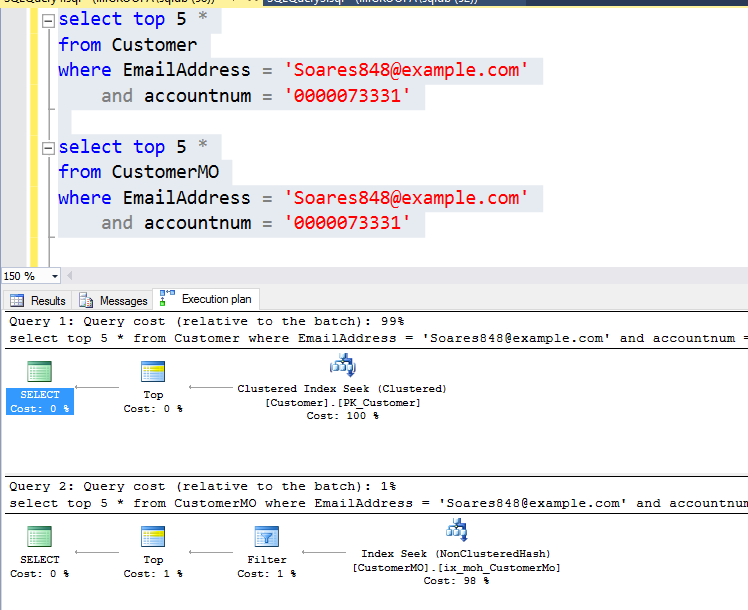 - The emailaddress non-clustered index was created with only “emailaddress”. Note that “select *” results in a key lookup for the traditional table but does not for the memory optimized.