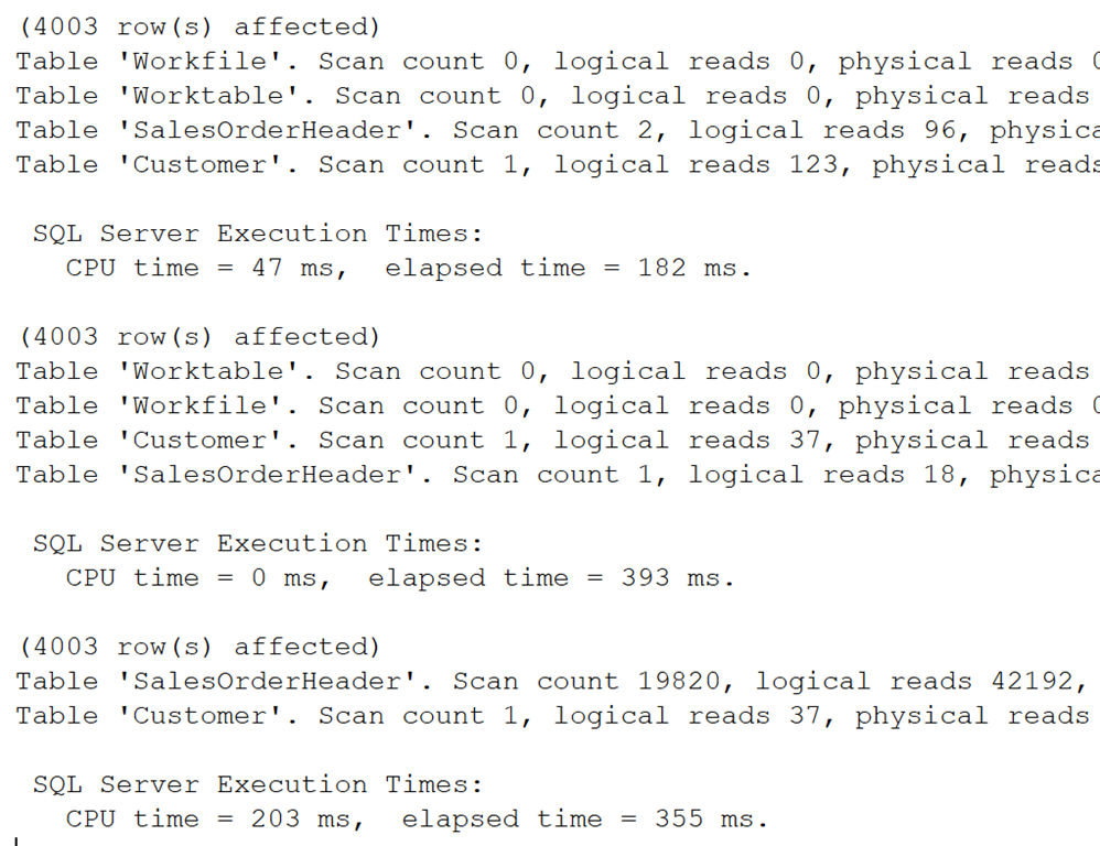 This shows that the CTE is actually the lowest cost; but, what if we look at the CPU and IO used with SET STATISTICS?