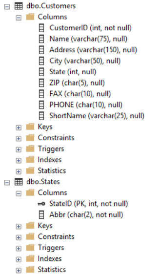 To join these you’d usually use a very simple inner join to get the state code, which could also be the state name which is longer than the 4 bytes for int. You may also include other metrics on the States table like geo data or capitol. For now let’s pretend like Abbr is much larger than State (int) so it would make sense to dump it to a lookup table.