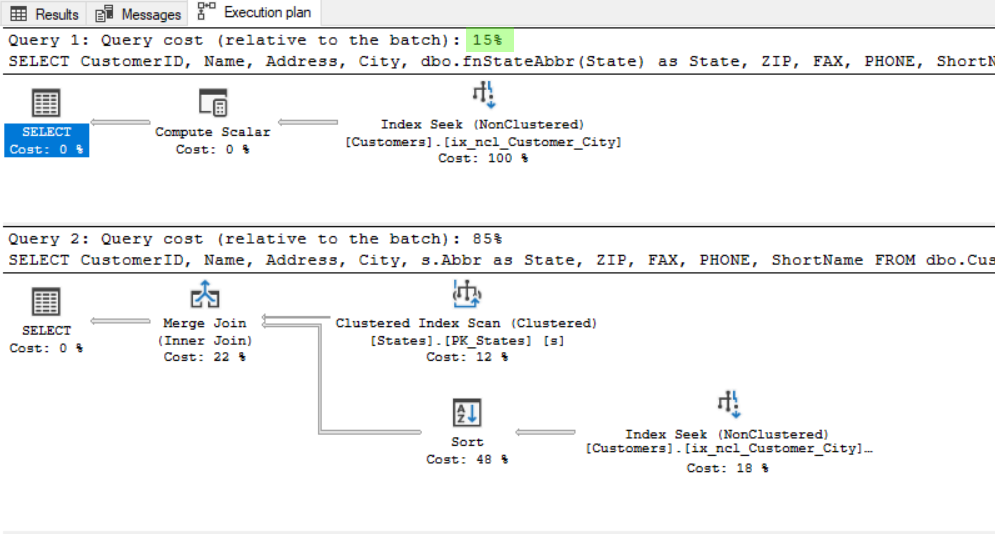 Wow! The query with the function has much less cost! Incredible results, right? Not so fast! Sometimes cost can be misleading. To perform a true test we’ll need to do a bit more. Let’s turn off the plan and turn on STATISTICS TIME.