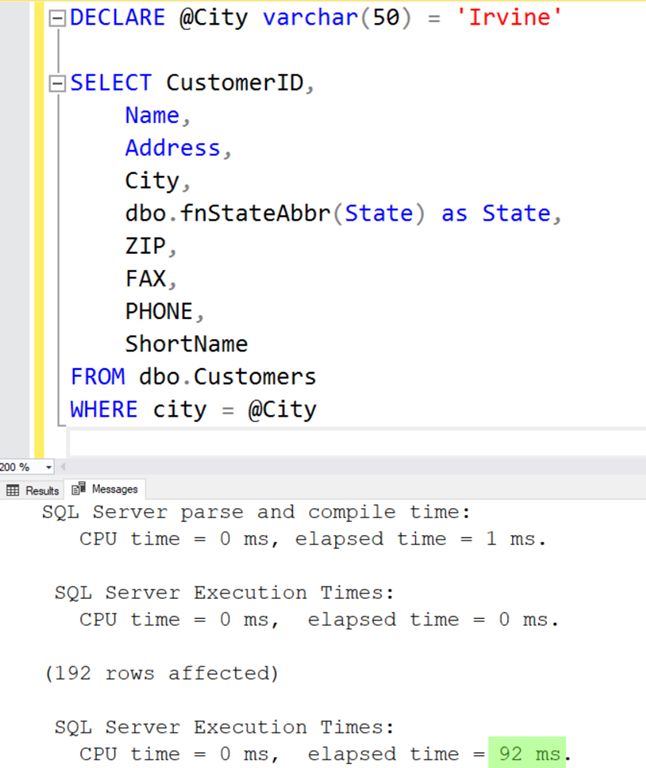 What we find is the function was executed 192 times. This is because the function must run once for each row in the result and it’s primarily this reason why scalar functions aren’t usually a great choice.