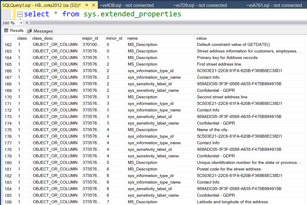 That’s right. It’s adding the classification to the extended properties, which is good news because we can query for those. You’ll notice that there are 4 properties added and depending on if you use extended properties already may just add more noise. If you query SYS.EXTENDED_PROPERTIES, you’ll find it’s not overly helpful.