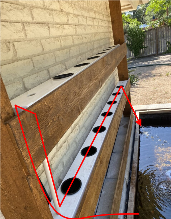 The following is a look from inside the plant rails. Water is pumped from the koi tank into the rail at the top right behind the bell siphon in the picture below. As the rail fills with water it will spill over the snorkel of the bell siphon which will trigger the siphon effect and drain all the water from the rail. This continues over and over to keep the water fresh: