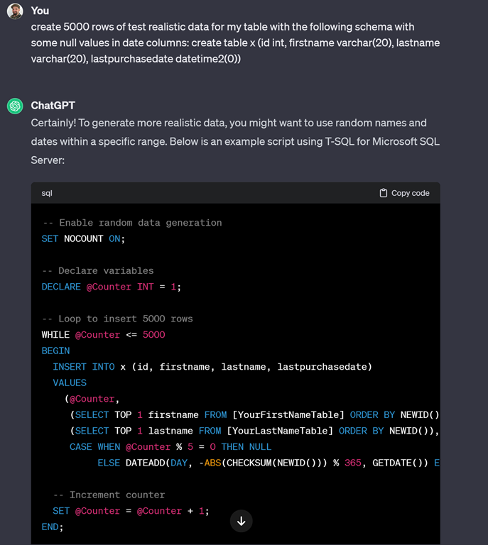 At first, I questioned if ChatGPT could create test data for a table schema at all, since it uses a generic model that isn’t specific to SQL code. I prompted “Create test data for my table with the following schema: create table x (id int, firstname varchar(20), lastname varchar(20), lastpurchasedate datetime2(0))” and the result was surprisingly good!!