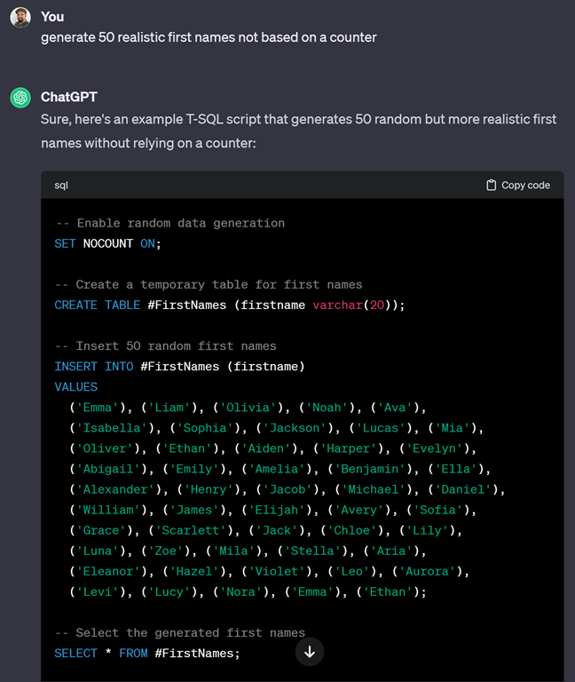 OK This code is good but there’s a big problem with it. It doesn’t actually generate any test data it assumes there is a firstname and lastname table to pull values from. But wait, We can use this code if we generate smaller batches of names using the prompts, right? Let’s see.  How many names can we generate at one time? The answer is 50. I tried 5000, 100, and then 50. Anything after 50 will result in 50 names and a comment saying “Add more data here”, lol. We can work with this though!
